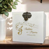 Une urne mariage en bois blanc gravée des notes de musique, parfaite pour les couples prêts à voyager à travers la musique pour leur plus beau jour.