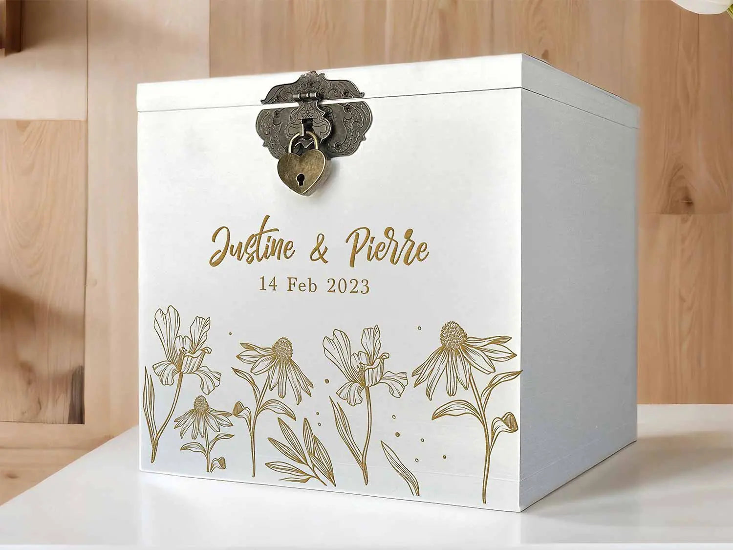 Ce modèle est soigneusement conçu en France à partir de matériaux durables. Chaque coffre mariage est façonné à la main, puis personnalisé selon vos envies : noms des mariés, date du grand jour ou mot doux gravé avec précision. Avec son ouverture discrète et sa capacité généreuse, il recueillera toutes les attentions de vos proches.
