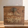 Urne mariage en bois de teinte noyer, au design glamour chic et raffiné, mettant en valeur des gravures dorées pour une allure somptueuse.