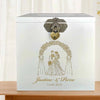 Cette urne en bois massif et peint blanc, gravée du portrait des mariés, apporte une touche glamour et sophistiquée à votre décoration de mariage.