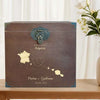 Urne mariage en bois de couleur noyer, design voyage et aventure, avec gravures évoquant les contrées lointaines pour un mariage audacieux.